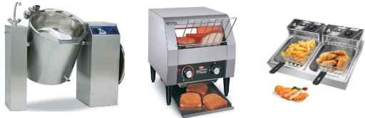 Galley, Pantry, Bar and Laundry Equipment. Vegetable slicer, Vegetable Cutter, Spar mixers, Peeling machine, Slicing machine, Cooking kettle, ovens, Holding cabinets and drawers, Range, Bratt pan, Fryer, Toaster conveyor, Bain marie, Cold cabinet, coffee machines, Water boiler, Waste disposer, Dishwasher.